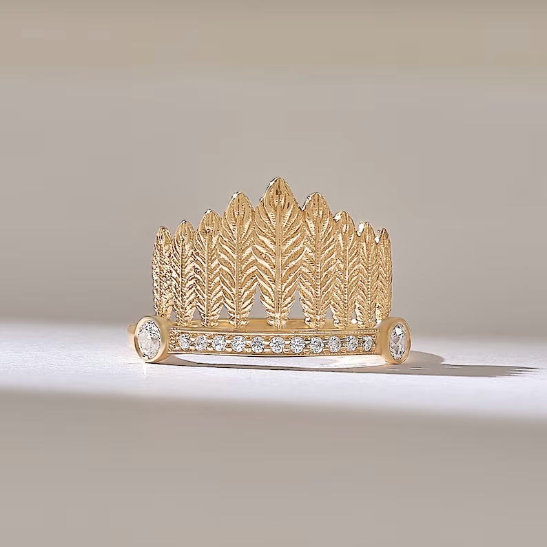 18k solid gold knife-edge crown ring with 0.36 ctw pave natural diamonds (GH COLOR, VS-SI Clarity). GIA & BIS certified. Unique enhancer band.
