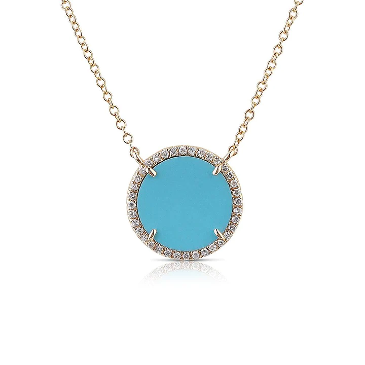 18k Solid Gold Turquoise And Diamond Round Necklace