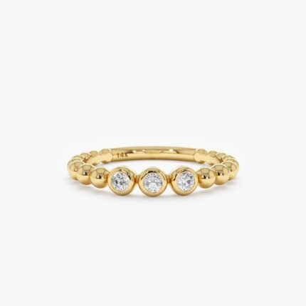14K Solid Gold Bezel Natural Diamond Beaded Ring