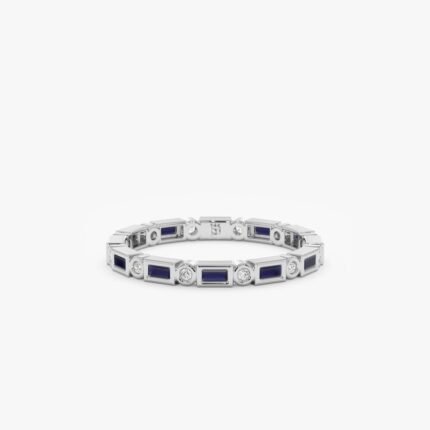 Elegant 14K solid gold eternity ring featuring alternating diamonds and baguette sapphires, offering a sophisticated and timeless design.