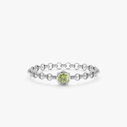 A chic 14K solid gold chain ring featuring a vibrant peridot, offering a modern and elegant design with a pop of color.