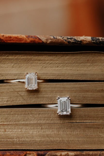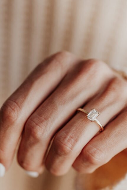 This emerald cut moissanite diamond solitaire ring features a secure double prong setting—blending bold brilliance with timeless, refined elegance.