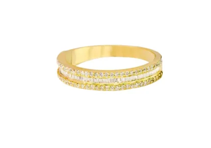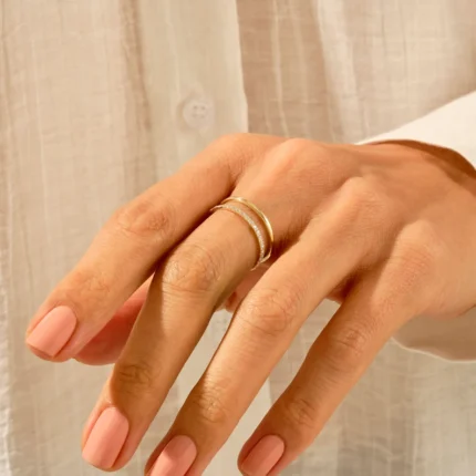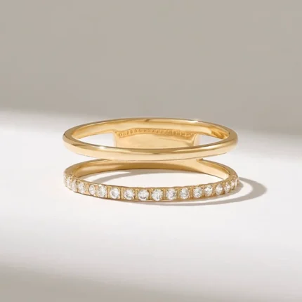 Elevate your look with this pavé moissanite double wedding band, crafted in 14K solid gold. A minimalist enhancer with dazzling sparkle and elegance.