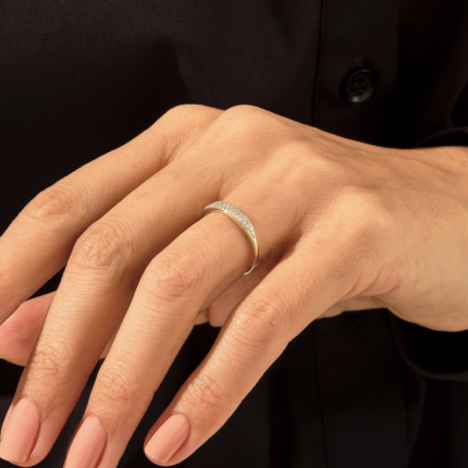 This 14K gold half eternity ring features moissanite diamonds in a sleek band—ideal for women who love refined elegance, perfect for weddings or stacking.