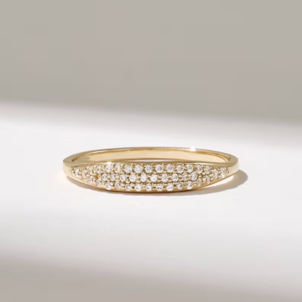 This 14K gold minimalist signet ring features pavé moissanite diamonds—perfect as a chic pinky statement ring with refined sparkle and sleek design.