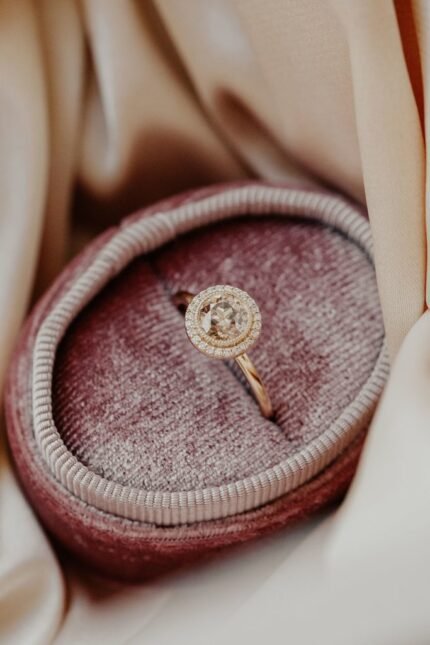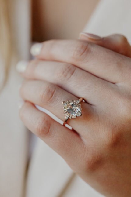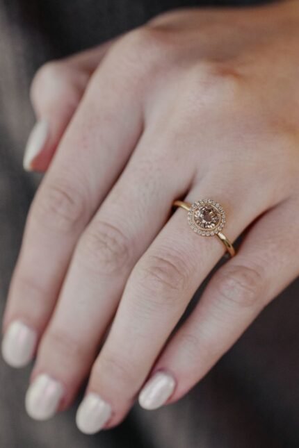 Elegant and timeless, The Alma Ring showcases a 1.00 ct round champagne moissanite diamond with a sparkling halo, offering a radiant, romantic glow.