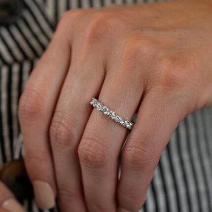 This 14K white gold eternity band from The Karat Store features a continuous row of shimmering moissanite diamonds — perfect for stacking or solo elegance.