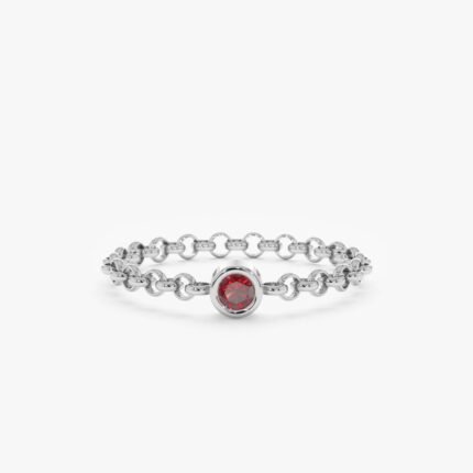 A sleek 14K solid gold ring featuring a delicate chain design with a vibrant ruby, offering a modern and elegant touch to any look.