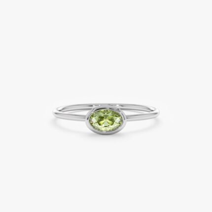 A stunning 14K solid gold ring featuring a vibrant oval peridot, offering a fresh and elegant touch to any jewelry collection.