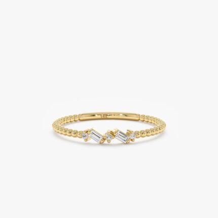 14K Solid Gold Beaded Ring with 0.08 ct natural diamonds in a sideways setting. GH color, VS-SI clarity. Band thickness 1.5 mm. BIS & GIA certified.