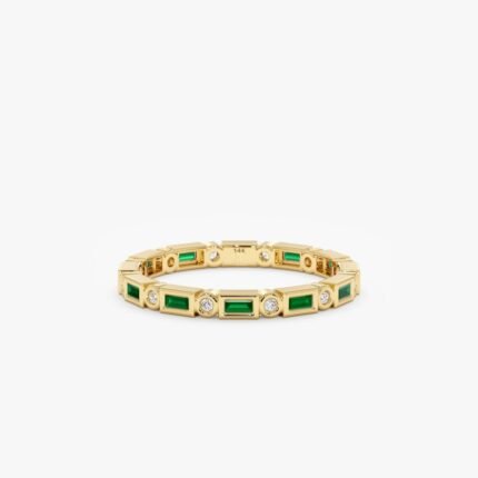 Timeless 14K solid gold eternity ring adorned with sparkling diamonds and baguette-cut emeralds—elegant, vibrant, and perfect for daily luxury.