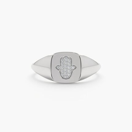 14K Gold Hamsa Signet Ring with 0.05 ctw Diamonds – a meaningful design, GIA & BIS certified.