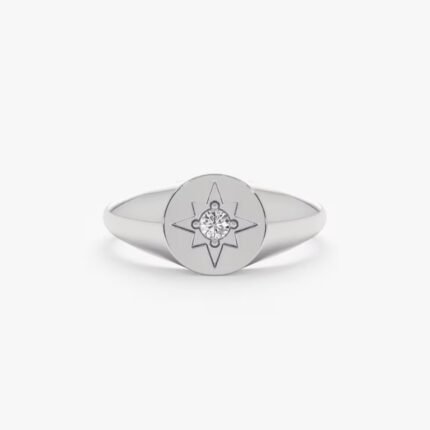 14K solid gold signet ring with a diamond starburst motif (0.08ct, GH/VS-SI). 8 mm round top. GIA certified, BIS hallmarked. 3 gold tones available.