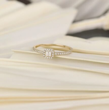 Petite 14K gold engagement ring with 0.14ct GH/VS-SI diamonds. 1.2 mm band, 5 mm top. GIA certified, BIS hallmarked. Available in 3 gold tones.