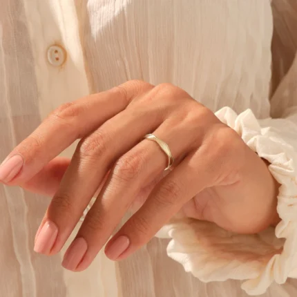 A graceful wave-shaped ring crafted in 14K gold, adorned with pave-set diamonds. Perfect for stacking or wearing solo with effortless elegance.