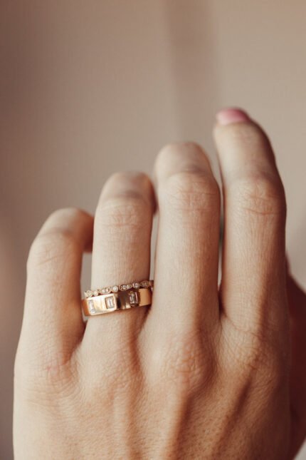 Three Diamonds in Migraine Bezel Band , Minimal Gold Ring