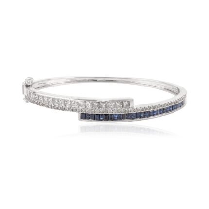 A luxurious 18k solid gold cuff bangle bracelet featuring blue sapphires and sparkling diamonds, offering a sophisticated and elegant design.