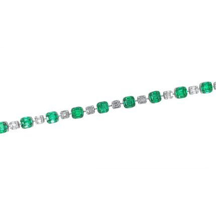 A stunning 14K solid gold tennis bracelet featuring emerald baguettes and diamonds, crafted in an illusion setting for a sleek, elegant, and vibrant design.