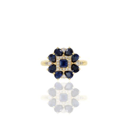 Exquisite 18k solid gold blue sapphire and diamond flower ring, featuring vibrant blue sapphires and sparkling diamonds arranged in a delicate flower design for a chic and elegant look.