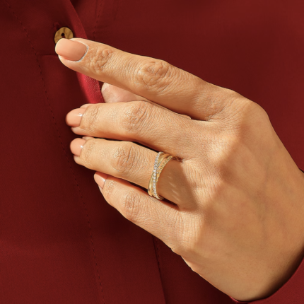 Make a sophisticated statement with this triple band crossover ring, crafted in 18k solid gold and encrusted with pavé moissanite diamonds for maximum brilliance.