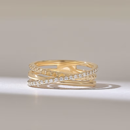 Triple Band Crossover Ring, Pave Moissanite Diamond Statement in 18K Solid Gold for Women
