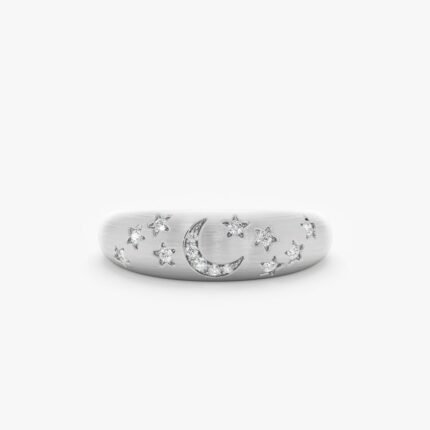 14K Solid Gold Natural Diamond Moon Star Brushed Dome Ring