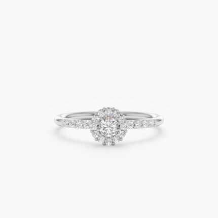 Diamond halo engagement ring in 14K gold with 0.26 Ct GH/VS-SI natural diamonds. 6 mm setting on 1.4 mm band. BIS Hallmarked & GIA certified.