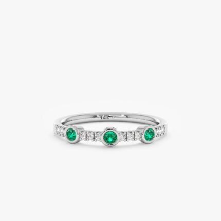 14K Solid Gold Diamond and Round Bezel Emerald Ring
