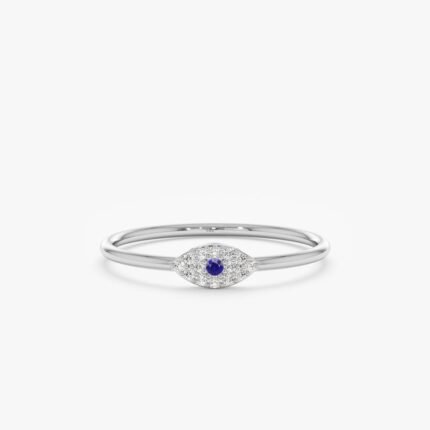 Stylish 18k solid gold evil eye ring featuring a single sapphire and natural diamonds—a unique blend of protection and elegance.