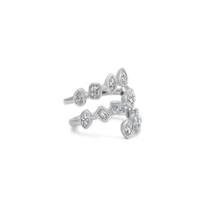 The 14K Gold Multi Diamond Shape Spaced Bezel Wrap Ring features 0.78 cts of lab-grown diamonds in round, princess, and marquise shapes. Set in a modern wrap design with bezel settings, this ring offers an elegant and chic look, perfect for any occasion.