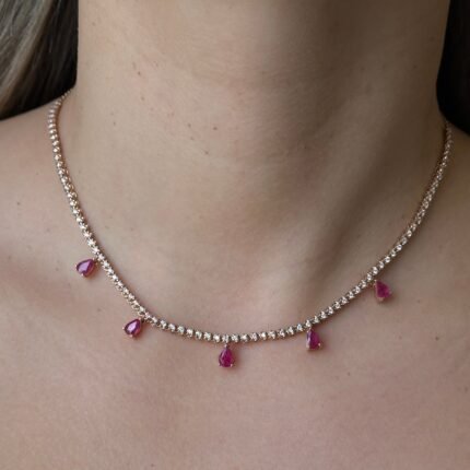 14K Gold Natural Diamond Ruby Pear Drop Necklace