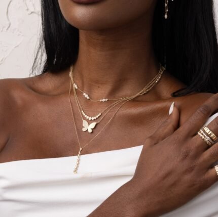 The 14K Gold Multi Shape Drops Necklace showcases 3.13 cts of lab-grown diamonds in unique shapes. The adjustable chain and polished finish make it a versatile and elegant piece.