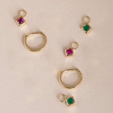14K Solid Gold Natural Diamond Huggies & Gemstone Charms