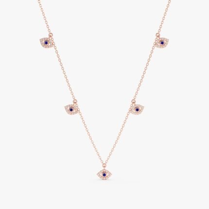 Evil Eye Charms Necklace: A captivating 14k gold necklace adorned with five evil eye charms crafted from natural diamonds and a brilliant blue sapphire center.