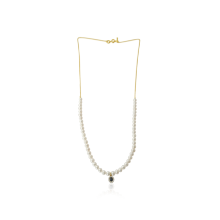 Luxurious 14K gold necklace with blue sapphire, lab grown diamonds, and a pearl drop. Available in yellow, rose, or white gold.