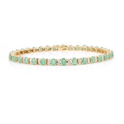 Elegant 18k solid gold tennis bracelet featuring vibrant emeralds and sparkling diamonds in a timeless designer setting.