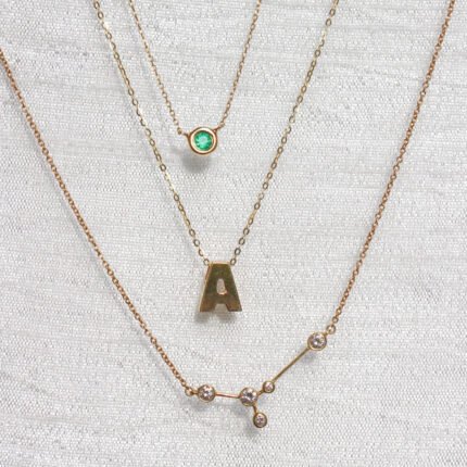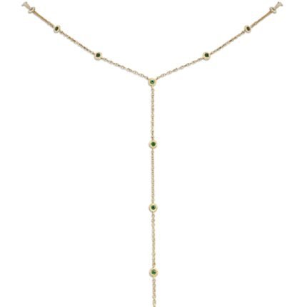 A stunning 14K solid gold lariat chain necklace featuring a bezel-set emerald, offering a chic and elegant design that adds a pop of color to any outfit.