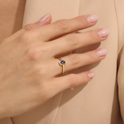 Minimalist 14K solid gold ring featuring a bezel-set iolite solitaire—crafted for rich violet-blue elegance, subtle sparkle, and modern charm.