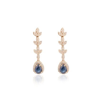 14K Solid Gold Blue Sapphire Diamond Dangling Chain Earrings
