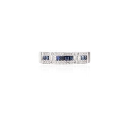 A beautiful 14K solid gold band ring featuring blue sapphires and sparkling diamonds, offering a timeless and elegant design perfect for any occasion.