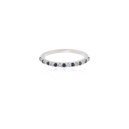 A beautiful 14K solid gold half eternity band featuring blue sapphires and sparkling diamonds, offering a sophisticated and timeless design perfect for any occasion.