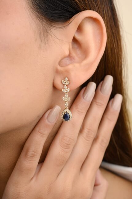 Elegant 14K solid gold dangle earrings featuring vibrant blue sapphires and sparkling diamonds, offering a sophisticated and timeless design perfect for any occasion.