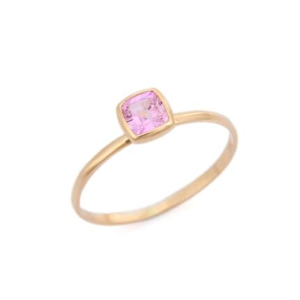 A stunning 14K solid gold ring featuring a vibrant cushion-cut pink sapphire, offering a sophisticated and elegant design perfect for any occasion.