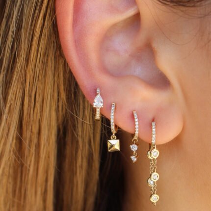 14K Gold Lab Grown Diamond Bezel Double Chain Loop Hoop Earring