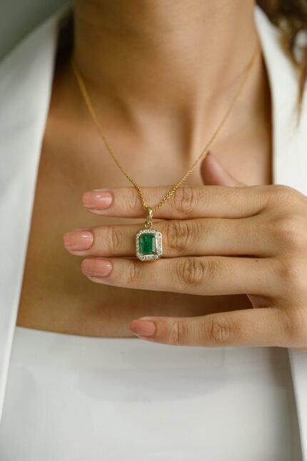 A stunning 14K solid gold pendant featuring a contemporary emerald surrounded by a halo of diamonds, offering a modern and elegant design.