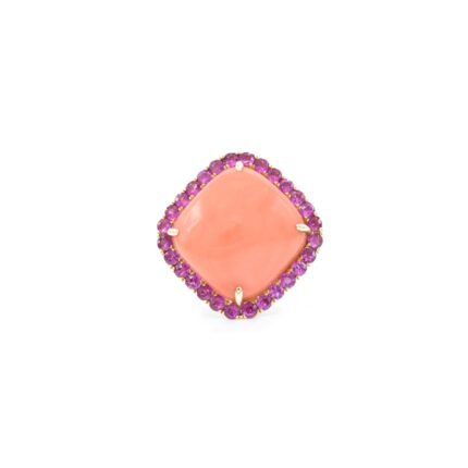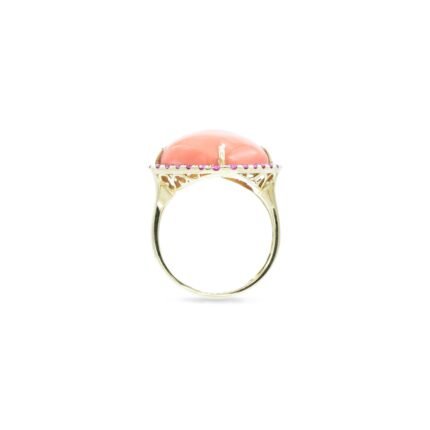 Elegant 14K solid gold ring featuring coral and opal accented with diamonds—crafted for soft sophistication and timeless, radiant beauty.