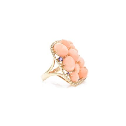 Vibrant 14K solid gold ring featuring coral and amethyst with sparkling diamonds—crafted for bold elegance, colorful charm, and timeless luxury.