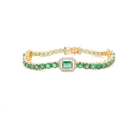 Elevate your wrist with the 18k Solid Gold Emerald Diamond Bracelet, adorned with 7.74 carats of emeralds and 0.43 carats of diamonds in a stunning yellow gold setting.