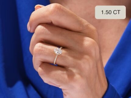 18k Solid Gold Oval-Cut Engagement Ring with 1.5 CT natural diamond. Features hidden halo design, GH color, VS-SI clarity, GIA & BIS certified. Available in all gold tones.