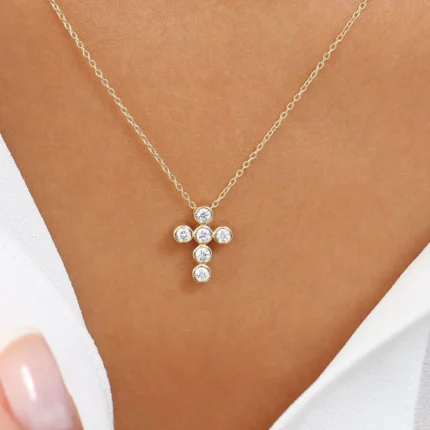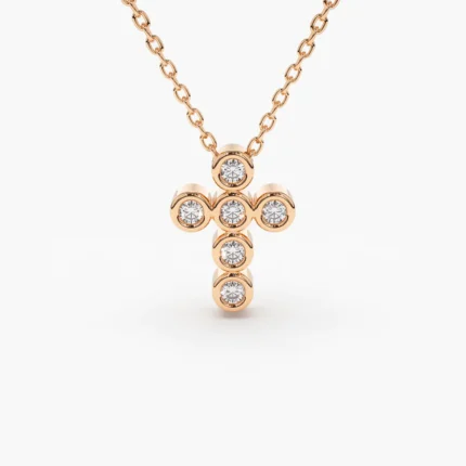 The 14K Gold 6 Stone Bezel Setting Natural Diamond Cross Necklace features 6 round diamonds (0.26 ct) in a bezel setting, creating an elegant cross design. Available in white, rose, and yellow gold, and BIS Hallmarked. Shipping within 10-12 business days with live chat and video call support.